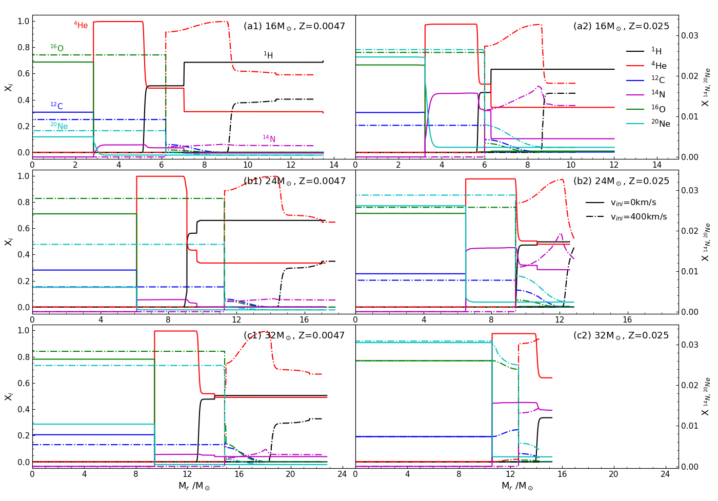 图三:不同初始质量,金属丰度和转动速度的大质量星在主序后期的化学元素的分布。