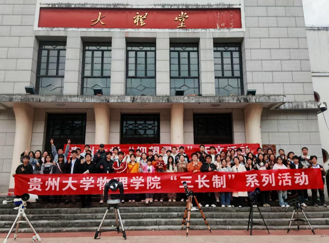 1115日下午,由贵州大学团委与物理学院联合主办的“循光探宇 仰望星空”天文科普活动在东校区大礼堂前成功举办。物理学院党委副书记陆定波出席活动,校关工委副主任匡萍波、副秘书长牟兰、李景勃、副秘书长兼物理学院关工委副主任董峰林亲临现场,勉励青年学生传承科学家精神,树立科技报国的远大理想。全校师生代表参与活动。