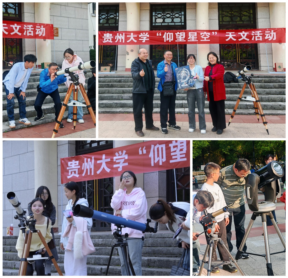 11月15日下午,由贵州大学团委与物理学院联合主办的“循光探宇 仰望星空”天文科普活动在东校区大礼堂前成功举办。物理学院党委副书记陆定波出席活动,校关工委副主任匡萍波、副秘书长牟兰、李景勃、副秘书长兼物理学院关工委副主任董峰林亲临现场,勉励青年学生传承科学家精神,树立科技报国的远大理想。全校师生代表参与活动。