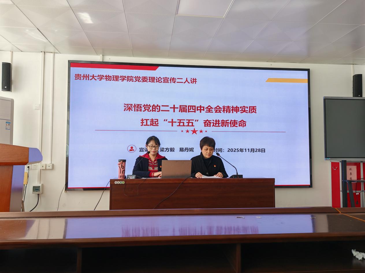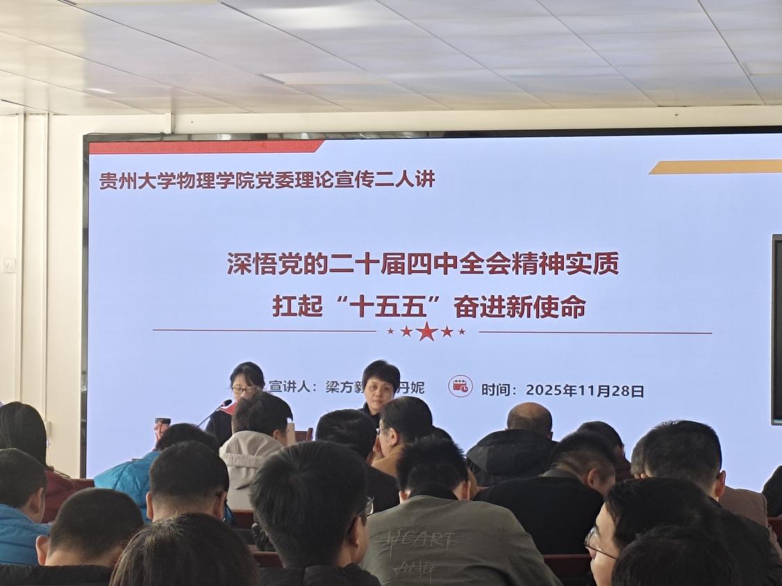 2025年11月28日中午,物理学院全体教职工及学生党员齐聚博学楼427会议室,共同聆听以“深悟党的二十届四中全会精神实质,扛起‘十五五’奋进新使命”为主题的“理论宣讲二人讲”活动。此次宣讲由物理学院党委书记梁方毅和马克思主义学院副教授易丹妮共同讲授。