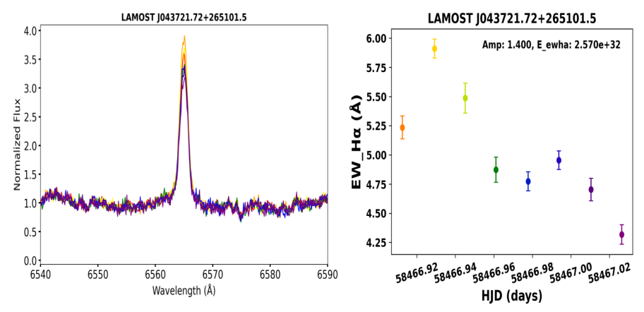 研究团队从LAMOST M型恒星光谱库中筛选出708,969条中分辨率光谱数据,最终获得11,868颗具有足够信噪比的可分析样本。相较于低分辨率光谱,本研究所使用的中分辨率光谱(R≈7500)能更精确刻画EWHα等磁活动指标的细微轮廓变化,极大提升了对弱活动与渐变过程的识别能力(图1)。在对 Hα线变化的研究中,识别了 119颗具有EWHα值变化类耀斑事件的恒星(快速上升和缓慢下降),并计算了这些事件的EWHα变化的能量和幅度。能量范围为 6.12×1028 - 3.05×1035 erg。