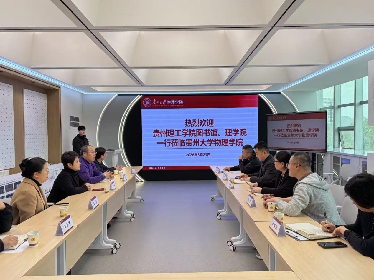2026年3月23日,贵州理工学院图书馆副馆长胡德慧、理学院副院长张世功率队一行来到贵州大学物理学院访问交流。双方就如何开展科普讲座、加强学科建设和人才培养等事项开展合作交流。贵州大学物理学院党委书记梁方毅、副院长刘艳辉等参加座谈。