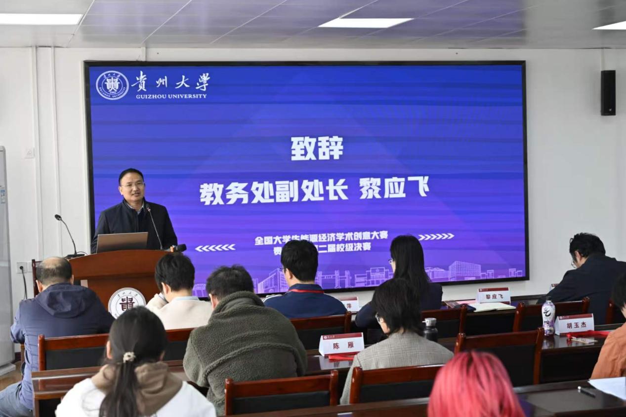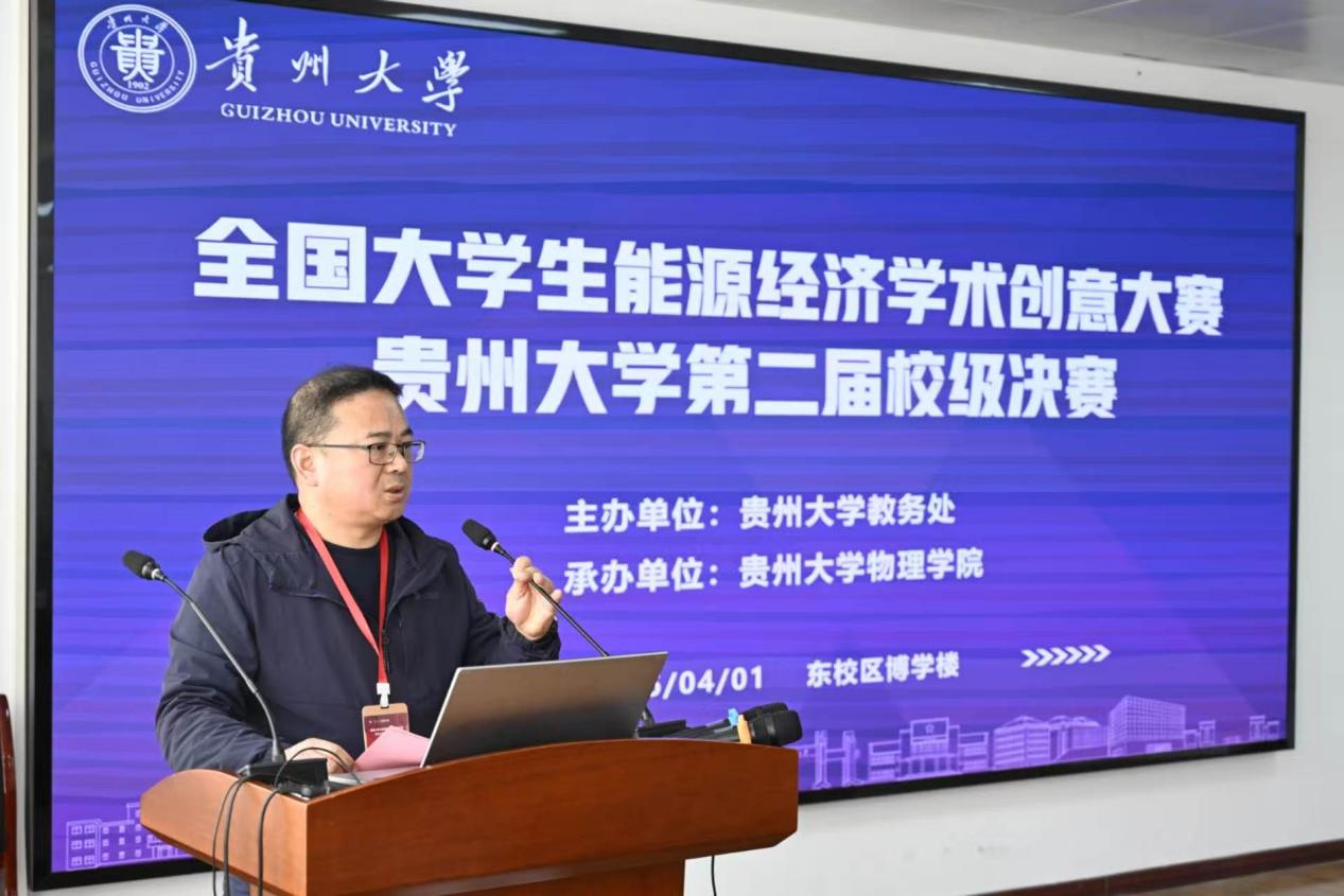 4月1日,第十二届全国大学生能源经济学术创意大赛贵州大学校赛决赛开幕式在东校区博学楼427报告厅举行。本次大赛由贵州大学教务处主办、物理学院承办,大赛旨在响应国家重大战略需求、深入落实国家“双碳”战略,推进各学科深度融合,培育复合型创新人才,激发大学生的学术热情,提升能源经济领域的创新能力和实践能力。贵州大学教务处副处长黎应飞,物理学院党委书记梁方毅,经济学院副院长朱满德,电气工程学院副院长陈湘萍及12位校内外专家评委、参赛团队代表参加开幕式。开幕式由物理学院副院长祁小四主持。