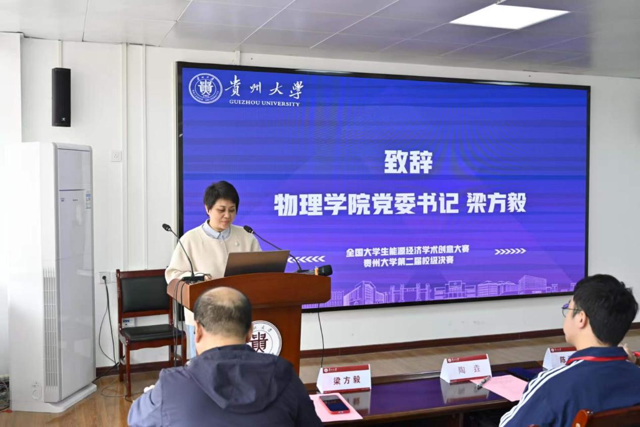 梁方毅对各位领导、专家及参赛师生表示欢迎与感谢。她指出,本届赛事在物理学院、经济学院合作基础上,新增电气工程学院共同参与,标志着大赛正从“理经结合”向“理工文贯通”的跨越,物理探求本源、经济管理优化配置,电器聚焦应用,这种跨学科协同正是培育新质生产力,造就复合型拔尖创新人才的最佳实践,形成多学科协同育人新格局。同时,本届作品聚焦能源经济、前沿经济,贵州发展的创意,充分展现了同学们卓越的创新潜能。创新是引领发展的第一动力,青年是创新活力的源泉。她勉励参赛同学充分交流展示,也恳请评审专家严格评审、悉心指导,助力作品提质精进。